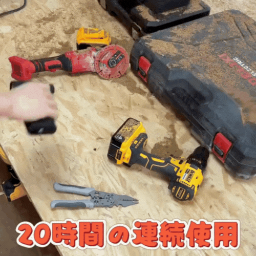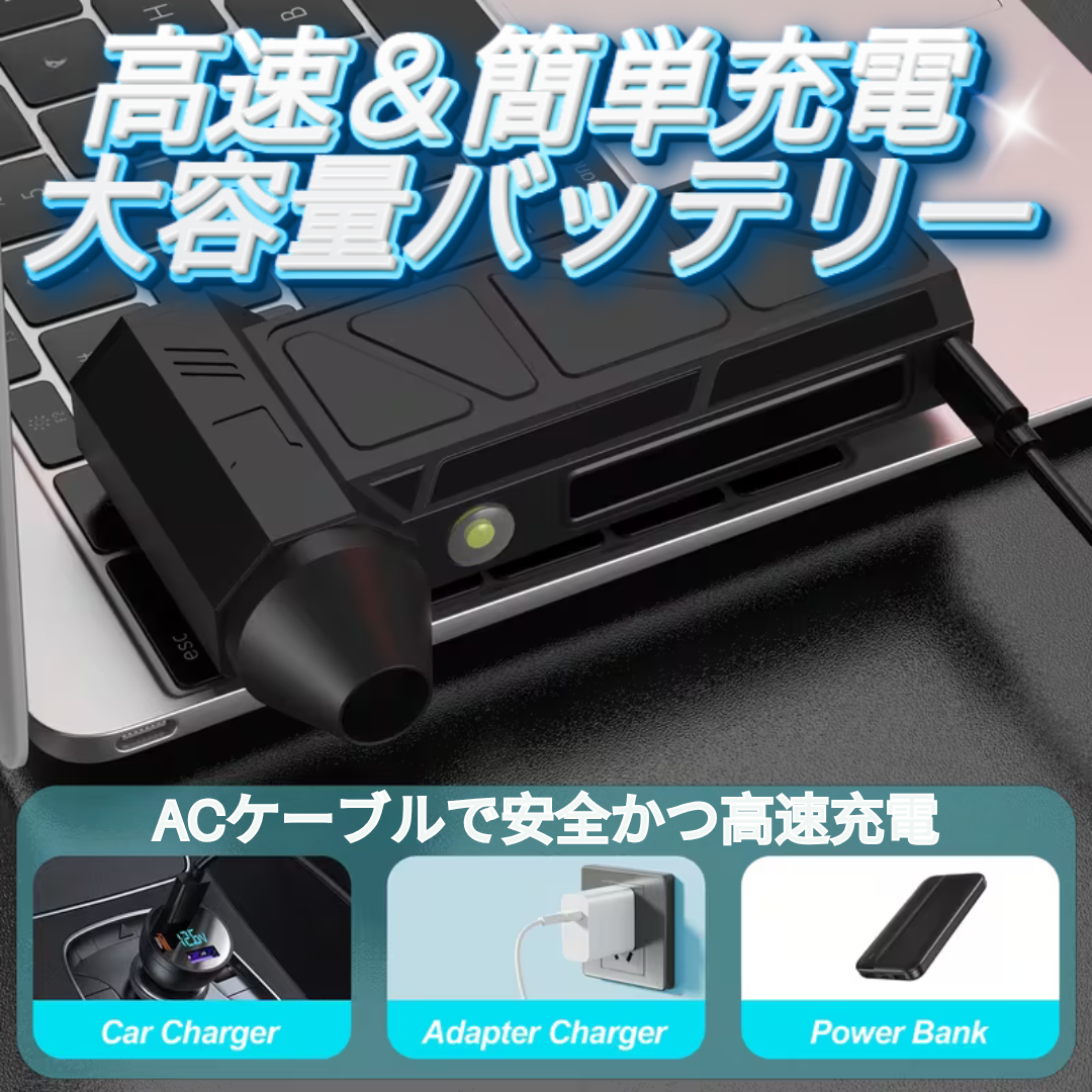 使用する風量レベルによりますが、フル充電で約1〜3時間の連続使用が可能です。大容量バッテリーを内蔵しており、付属のUSB Type-Cケーブルで簡単に充電できます。